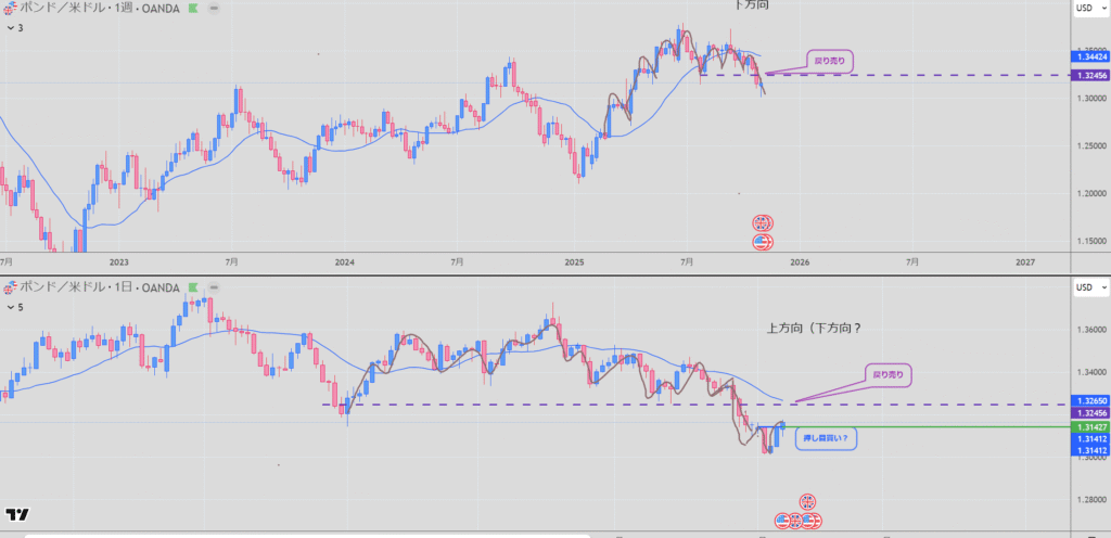 安値(買い支え)を下抜け後、、踊り売りまで戻ってきたところ