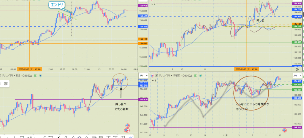 日足で押し目買いが入った判定だと合点がいく。上位足の押し判断は実際時間んがかかるのでその感覚が難しい。
