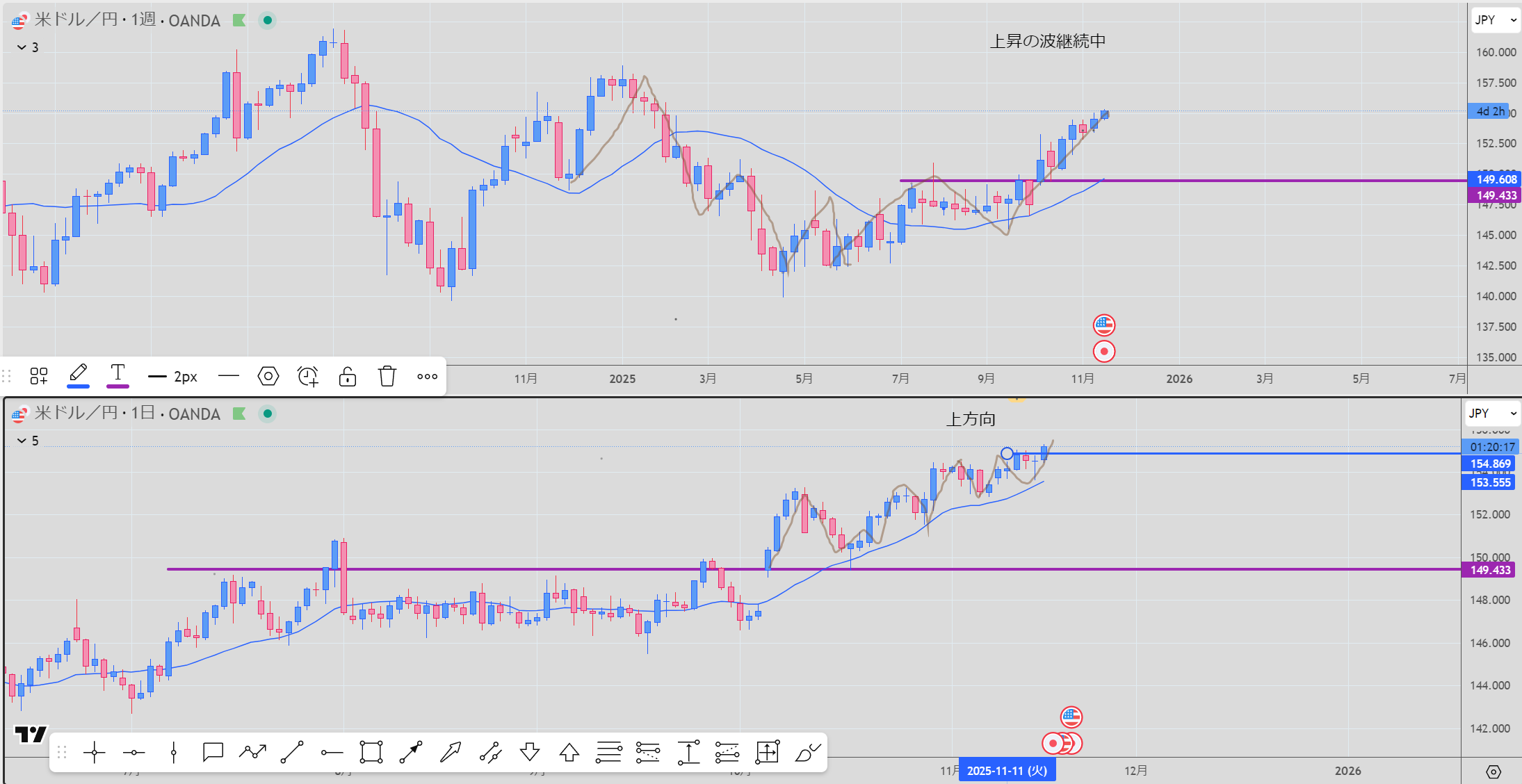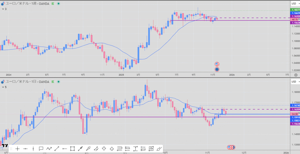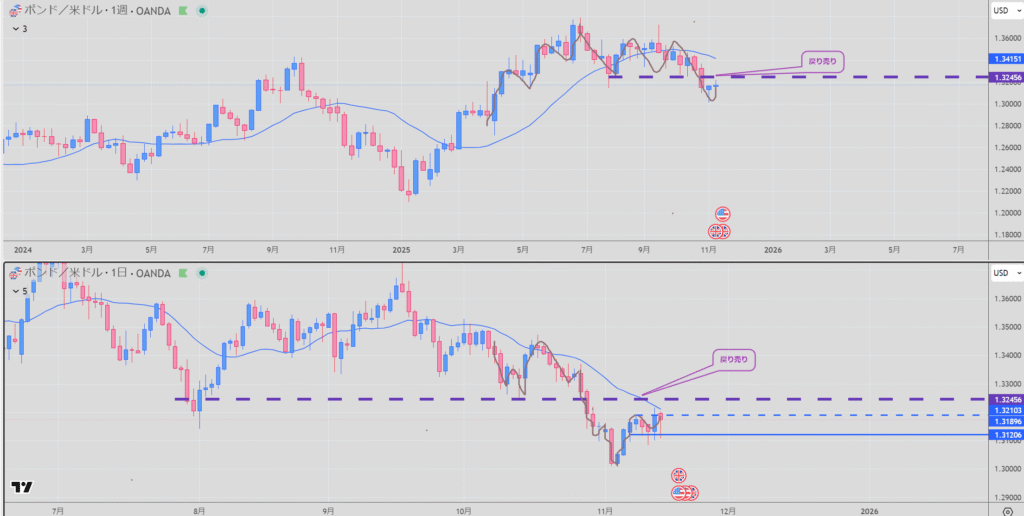 4H,1HともMAの上にローソクが位置したエントリ検討。上に週のレジがあるので要注意