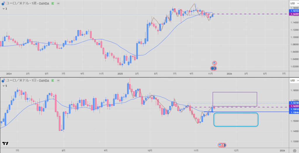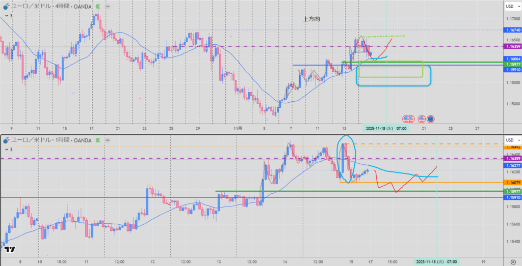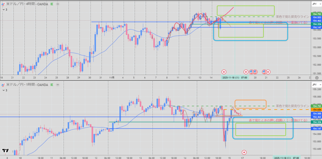 4H,1HともMAの上にローソクが位置したエントリ検討。上に週のレジがあるので要注意