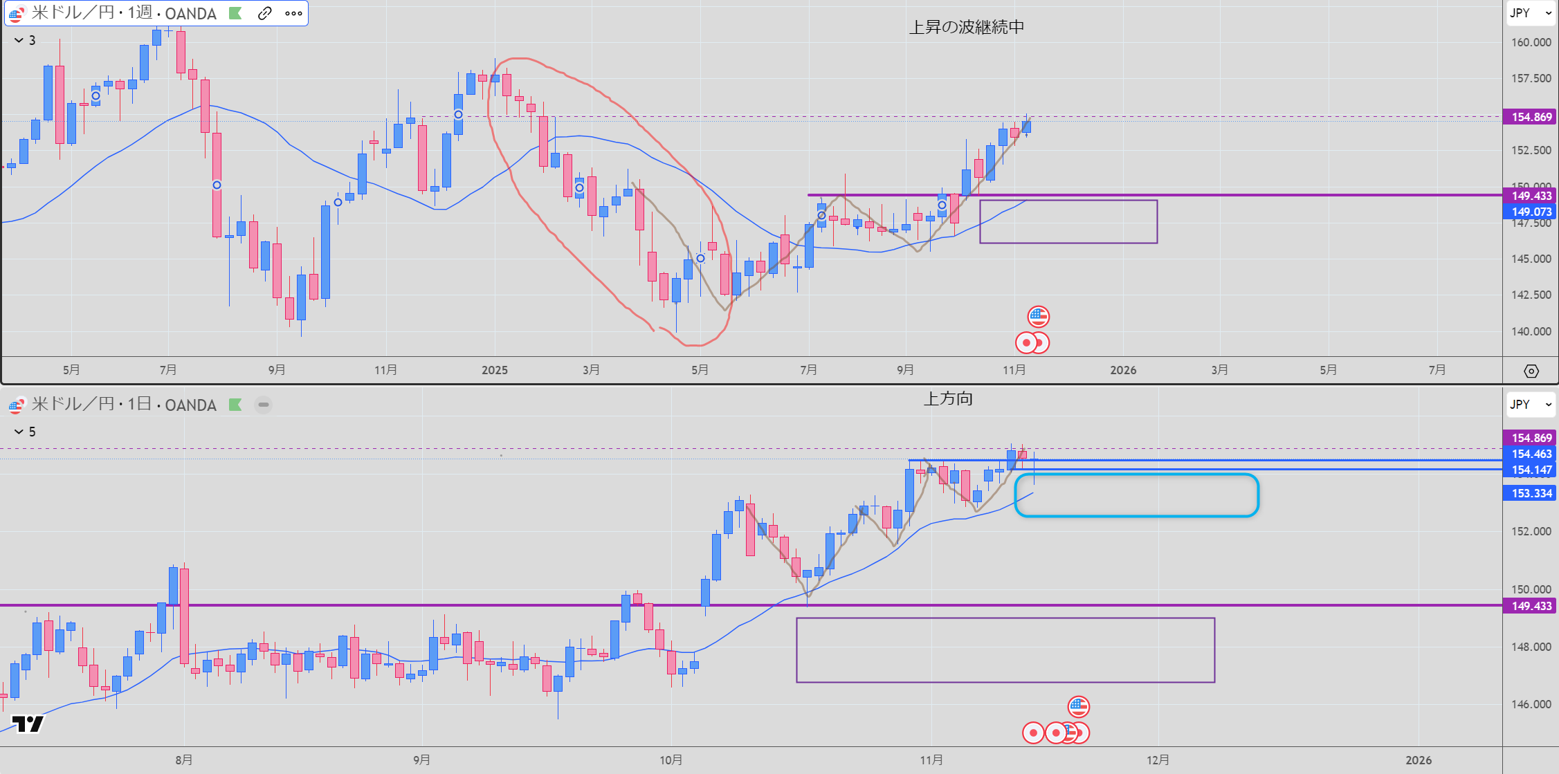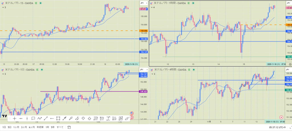 下位足が下向きに変わってきているので、このまま下位足から上位足に波及していくのだろうか。要観察。