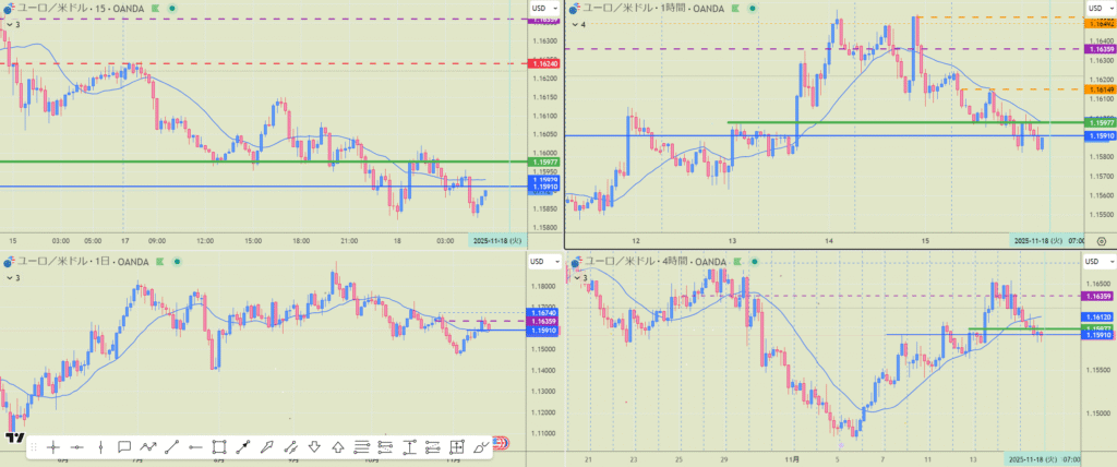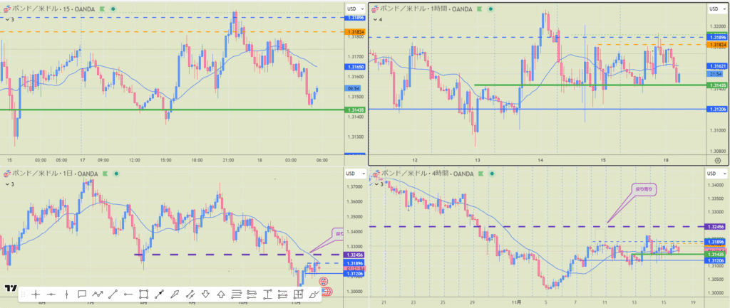 日足の下降の上限部分をを警戒しつつも 4Hで押目をつけるのか?と観察していた。今思うと4H押目をつけたとしても戻しすぎに見える。
