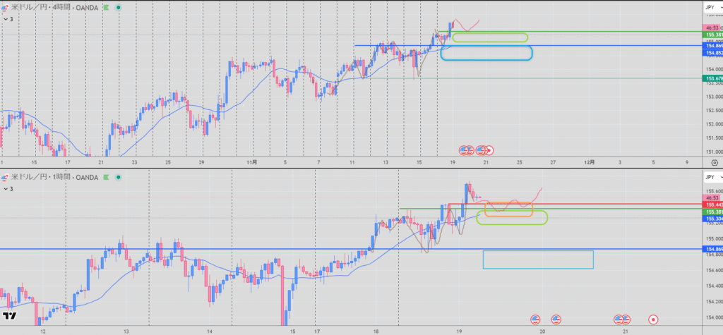 4H,1HともMAの上にローソクが位置したエントリ検討。上に週のレジがあるので要注意