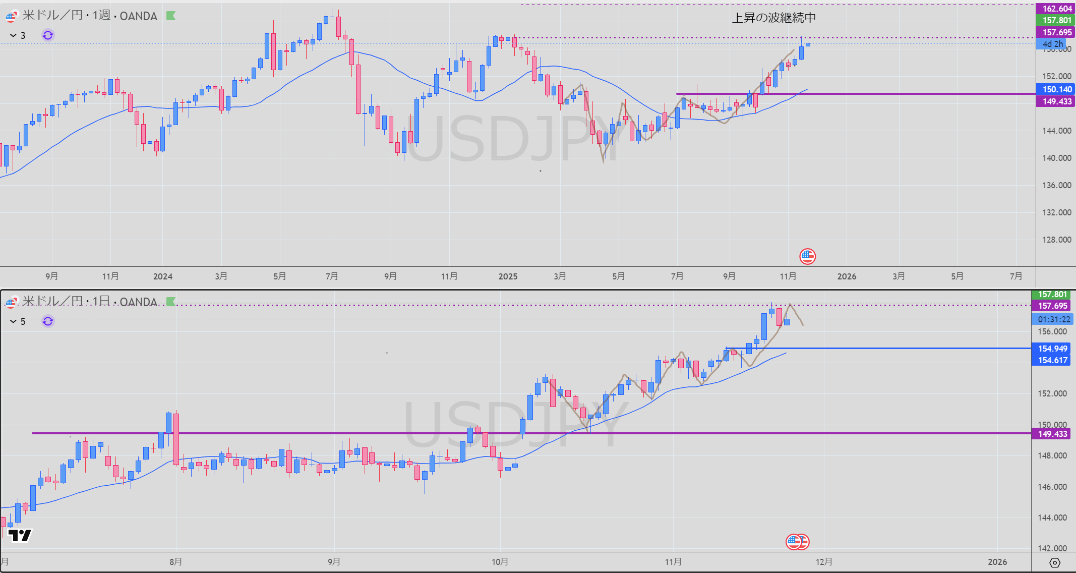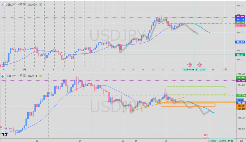4時間下降の波の途中も考えられる。その場合下位足の動きに注目。