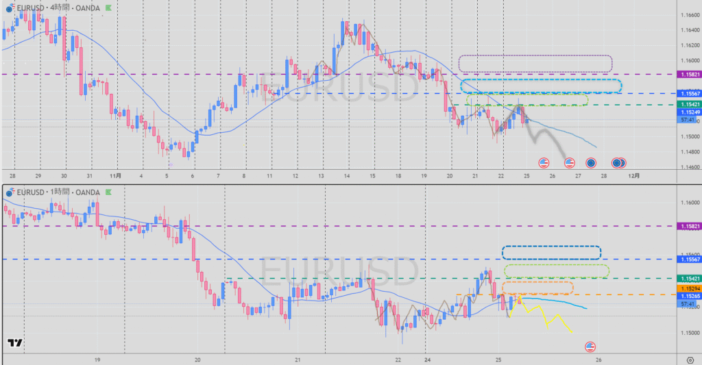 すでに4時間戻り売りまで来ているので、1時間の買い支えを下に割っていくか注目。