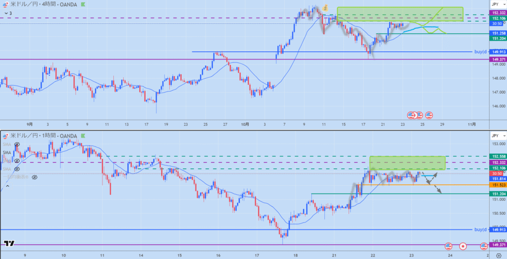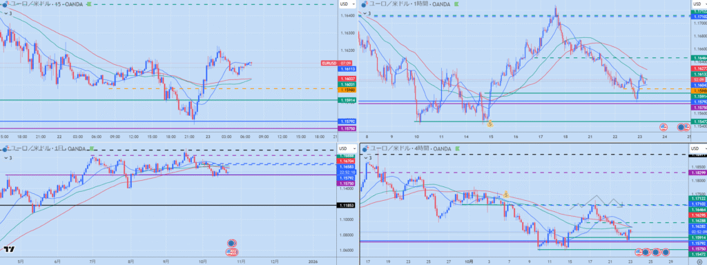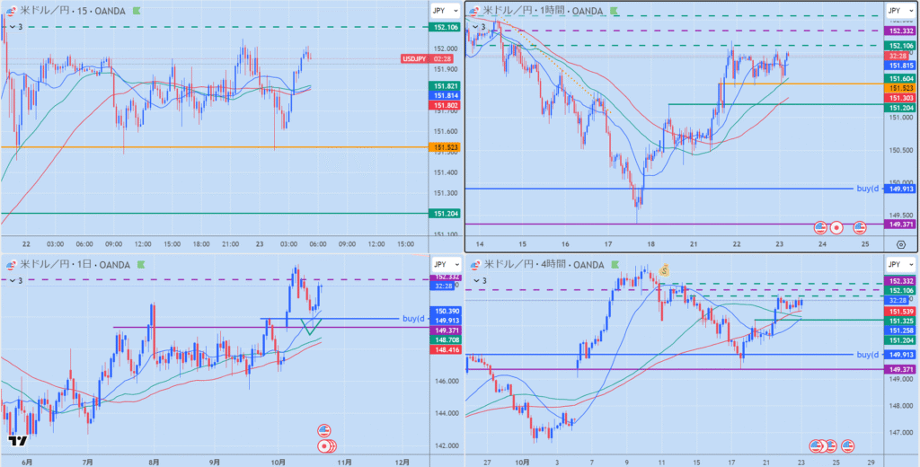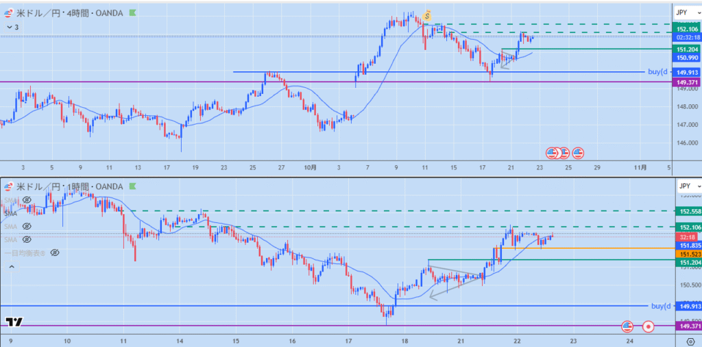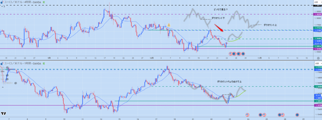 ローソク足 横向きのMAの上。下には1時間の買いサポート 上に1H・4Hの売りレジあり。