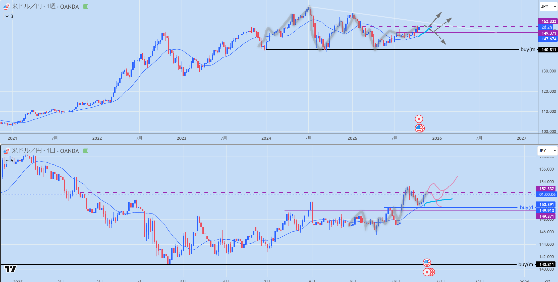 日足のサポレジ転換(サポート)ラインに戻ってくるも、ピンバーで刺さって反転(上向きMAにもタッチ反発)上昇中。昨日大陽線後のコマ足。