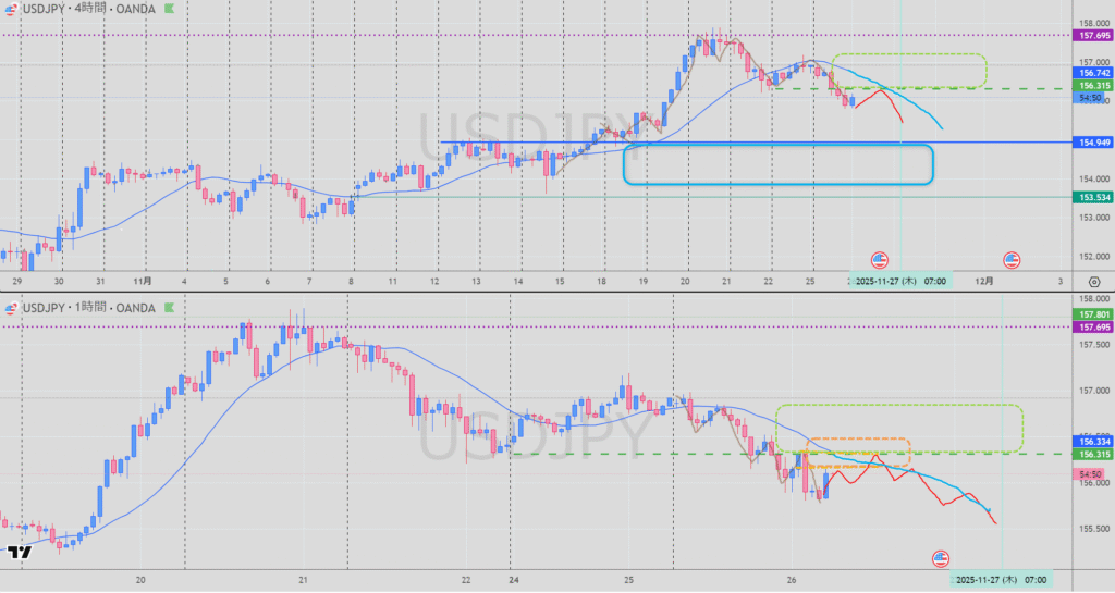 高値更新後 もみ合って現在4Hの売り抑え付近に位置