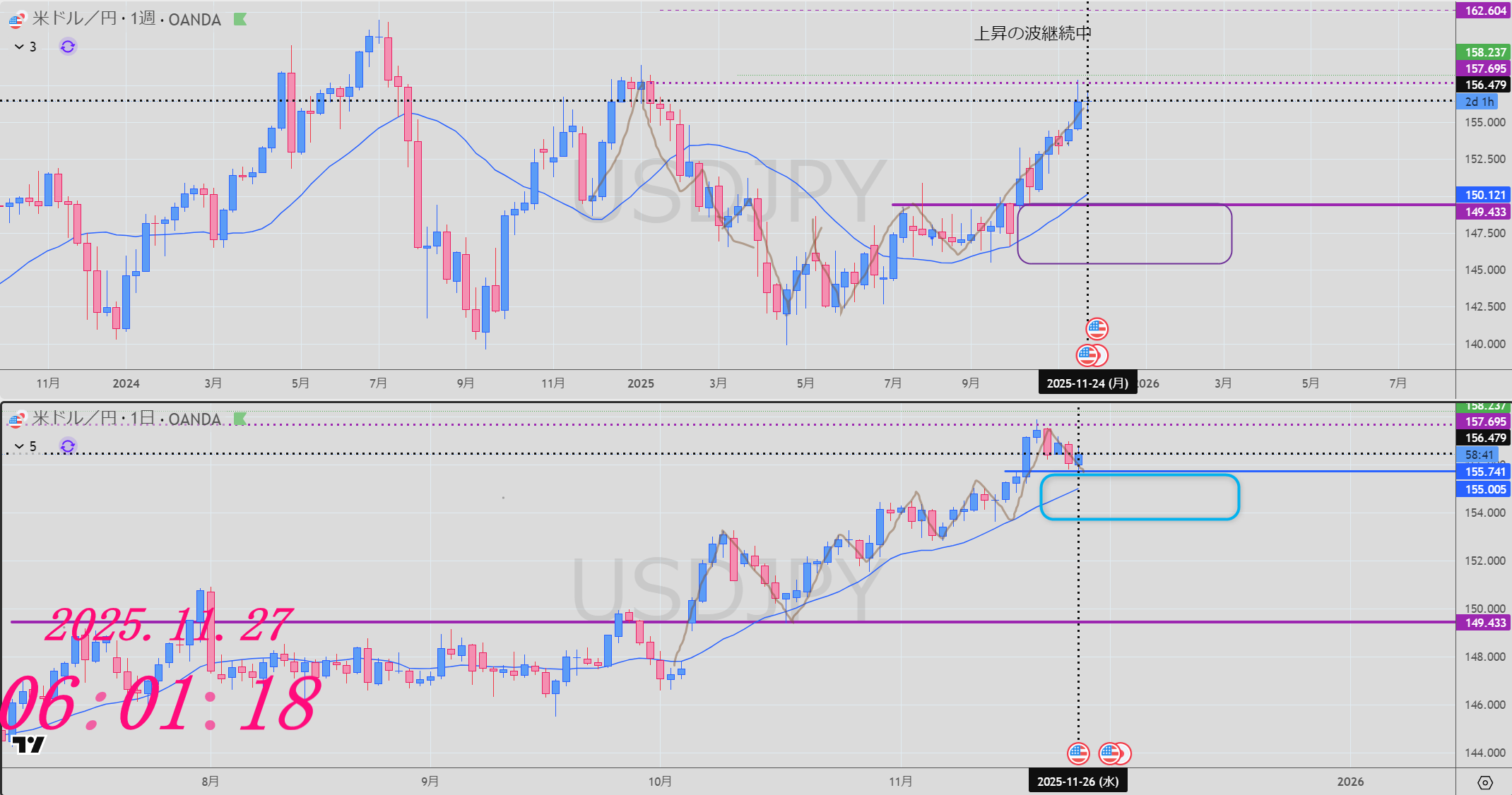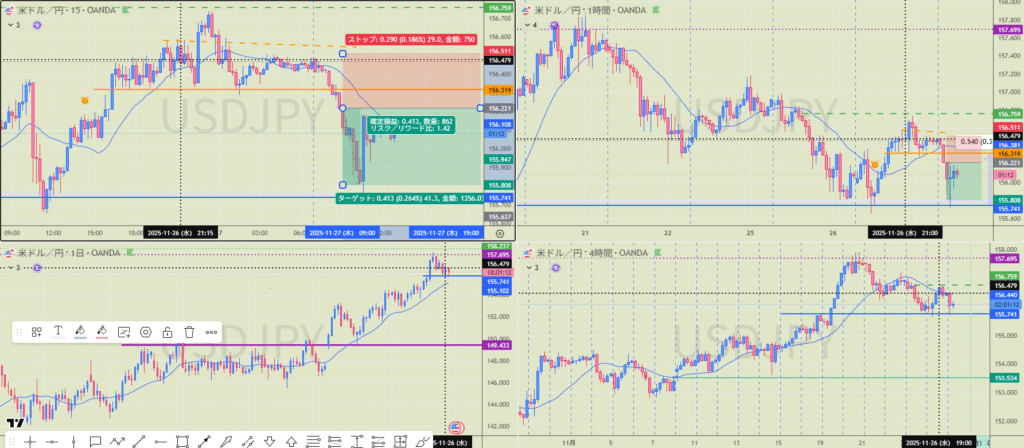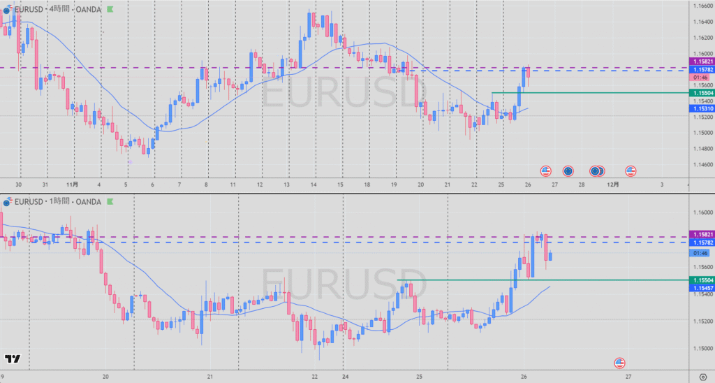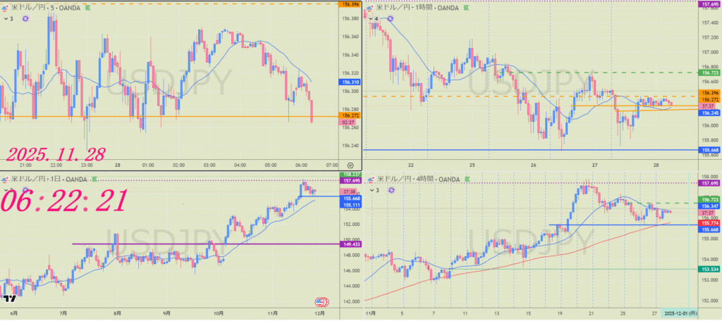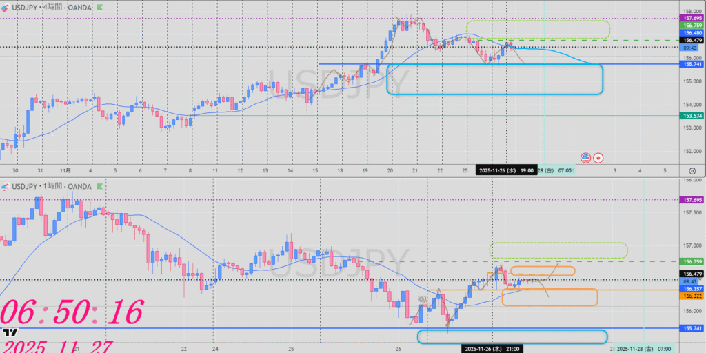 4時間足:日足の押目付近から上昇調整するも19時頃から朝まで調整状態。